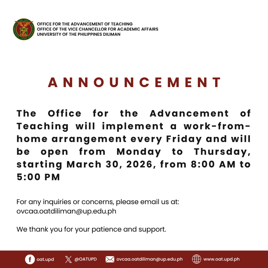 The Office for the Advancement of Teaching will implement a work-from-home arrangement every Friday and will be open from Monday to Thursday, starting March 30, 2026, from 8:00 AM to 5:00 PM.