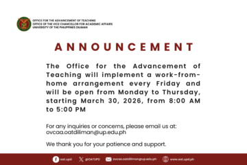 The Office for the Advancement of Teaching will implement a work-from-home arrangement every Friday and will be open from Monday to Thursday, starting March 30, 2026, from 8:00 AM to 5:00 PM.