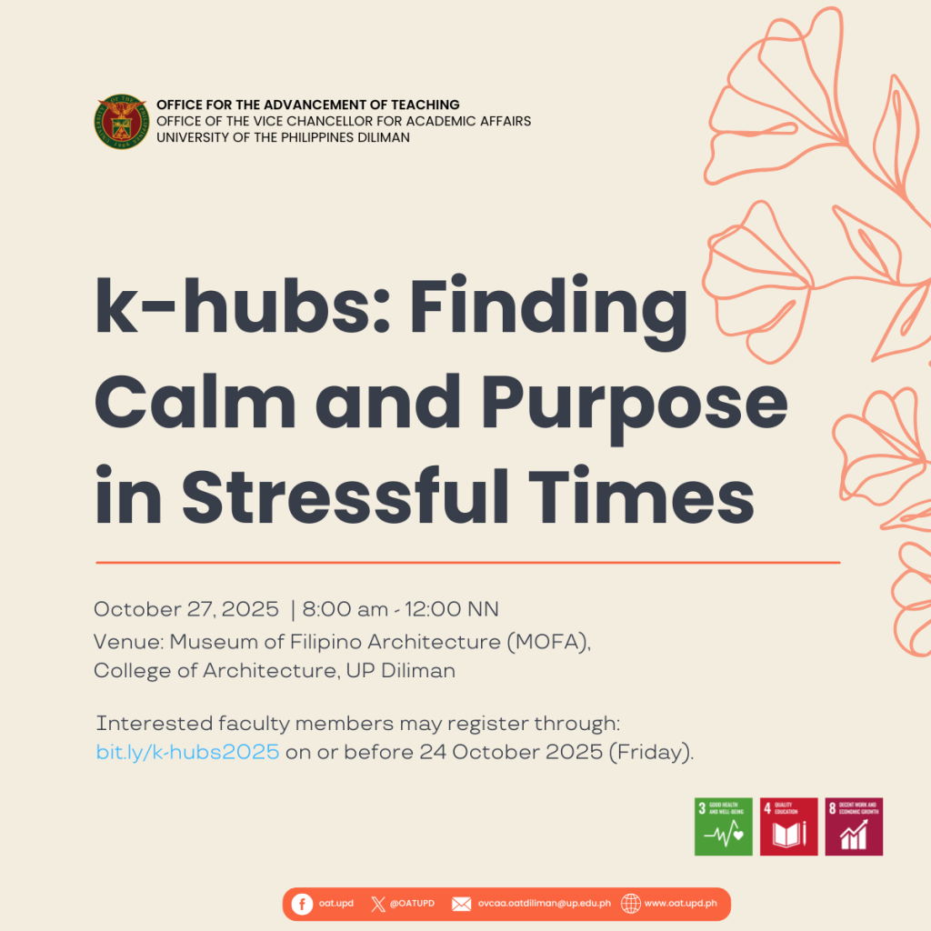 Please note that the slots for this workshop are limited and can only accommodate 50 participants on a first-come, first-served basis. Interested faculty members may register through https://bit.ly/k-hubs2025 on or before 24 October 2025 (Friday). For questions and clarifications, please contact the Office for the Advancement of Teaching at ovcaa.oatdiliman@up.edu.ph (ATTN: Ms. Zari).