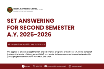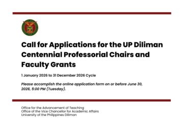 The UP Diliman Centennial Professorial Chairs and Faculty Grants (1 January 2026 – 31 December 2026 Cycle) are now open for applications. The online application form may be accessed through http://bit.ly/2026UPDCentennialApplications Faculty will need their UP mail (@up.edu.ph) to log in. To be eligible, an applicant must: 1. have been Read more